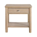 Add a touch of rustic charm and practical storage to your living space with this acacia wood end table. Crafted from acacia veneer, solid wood, and engineered wood, this table features a beautiful wire-brushed power glaze natural finish that highlights the wood's natural grain. It offers convenient storage with a smooth-gliding dovetail drawer for organizing essentials and a bottom open shelf for displaying décor or storing books. The polished chrome tone knob adds a touch of elegance, complementing the table's warm and inviting aesthetic. This versatile piece combines functionality with rustic charm, making it a perfect addition to any living room or bedroom.