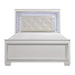Glamour reigns in the design of the Allura Collection. Framing the California King bed is a decorative beveled mirror accent that enhances the illumination from the touch-engaged LED backlight of the headboard and mirror, as well as the under-light of the night stand. The silver faux leather crystal-tufted headboard insert boldly accents the silver finish.